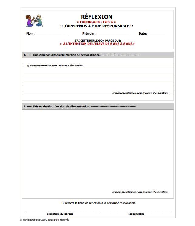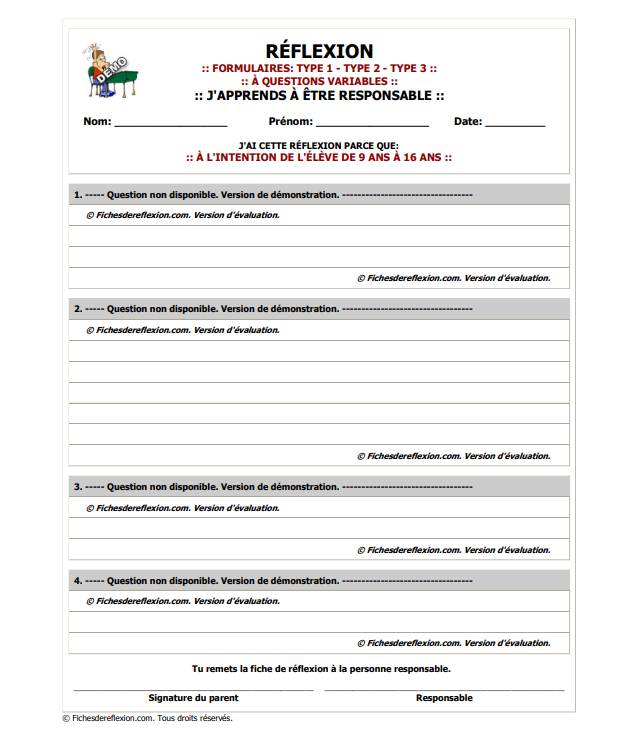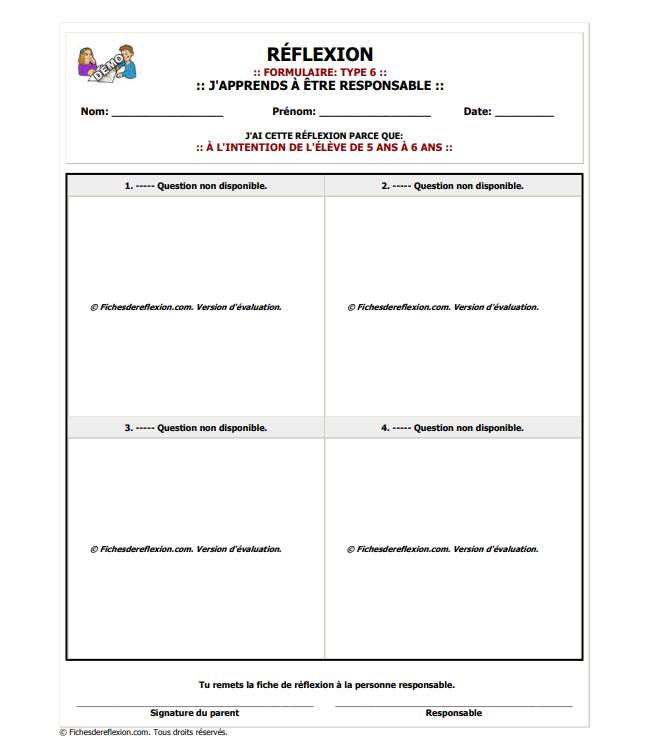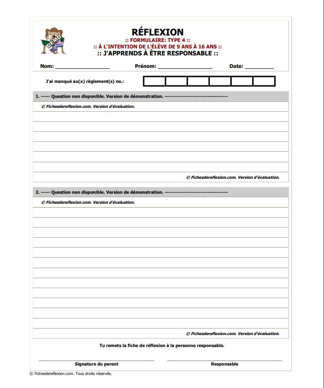- Les fiches de réflexion pour l’élève sur fichesdereflexion.com ont été conçues et adaptées selon un code de vie pédagogique et éducatif.