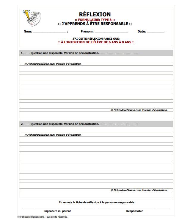 - L’utilisation d’une fiche de réflexion est une technique d’interrogation apprenant à un élève à faire l’exercice d’une prise de conscience des comportements inappropriés qu’il pose à l’école.