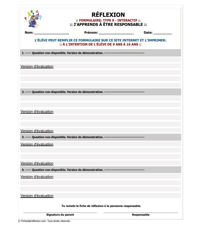 - 9 modèles de formulaires sont présentement disponibles en ligne sur fichesdereflexion.com. L'un de ces formulaires, l'élève peut le remplir directement à l'écran et l'imprimer.